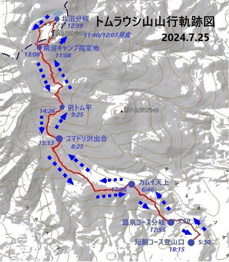 | 【コースタイム】山の交流館トムラ(4:00)~トムラウシ短縮ルート新登山口(5:30)~温泉コース分岐(5:50)~カムイ天上(6:40)~コマドリ沢出合(8:25)~前トム平(9:25)~南沼キャンプ指定地(11:08)~トムラウシ(11:40/12:07)~北沼分岐(12:39)~南沼キャンプ指定地(13:08)~前トム平(14:26)~コマドリ沢出合(15:13)~カムイ天上(17:06)~温泉コース分岐(17:55)~トムラウシ新登山口(18:15)~山の交流館トムラ(19:20) |