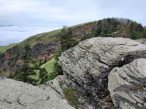 | 前日よりは霧が少なく、四阿山・根子岳が見え隠れする状態だった。天候の崩れが心配だったので先に四阿山に登ることにした。時々指す太陽の光が美しいシラカバ林の中を気持ち良く進み、途中からは針葉樹と大笹が茂り、ぬかるんだ道を注意しながら登った。四阿山山頂は山岳部の高校生など沢山の人達で賑わっていた。次の根子岳へは、濡れた木の根っこばかりの激下りが続いたが、鞍部まで来ると根子岳が美しい姿を見せてくれた。大笹に囲まれた登山道を進み、上部にある大岩を通り抜けると頂上に着いた。下りは遠くの景色を見ることが出来なかったが、あざやかな模様のクジャクチョウやひっそりと咲く花々が疲れを癒やしてくれた。 | |
