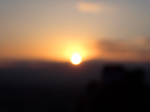| 昨年はご来光を見ることができかったので、今年は見るのを楽しみにしていました。鳥居前では、例年どおりかなりの人が車で来られていました。今回は当会の会員6名と一般の方1名で登りました。頂上では多くの人が太陽が上るのを待っていました。しばらくすると雲の間からご来光を拝むことができました。全員で安全登山を祈願し祝杯をあげました。初日の出山行は来年以降も続けますので会員の皆さんの積極的な参加をお願い致します。(S.Tsu.) |