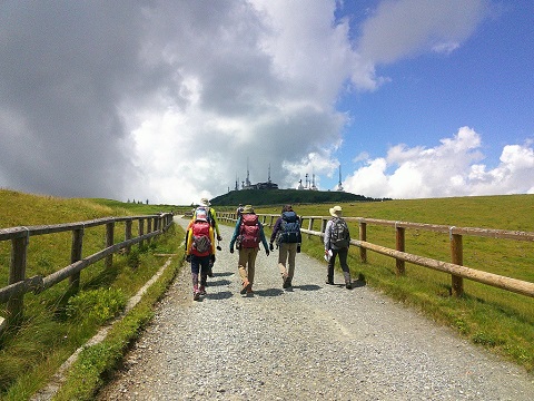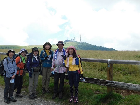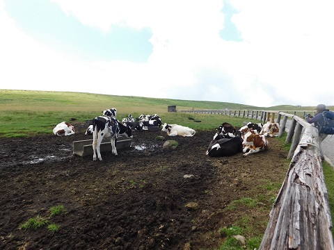 標高2000mの日本一の高さと広さの美ヶ原高原、広大な草原の牧場で牛がのんびりと草を食んでいる。道はほぼ水平で歩きやすいが黒い雲が立ち込め雷のゴロゴロと不気味な音が絶えず自聞こえてくる。目的の王ヶ鼻まで行くとついに雨が降り出した。アルプス展望コースは展望がないものの幾重にも重なる緑の草原を眺めながらの下りを楽しんだ。 | |