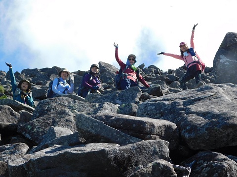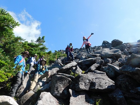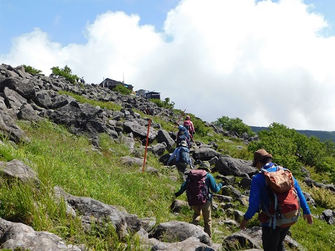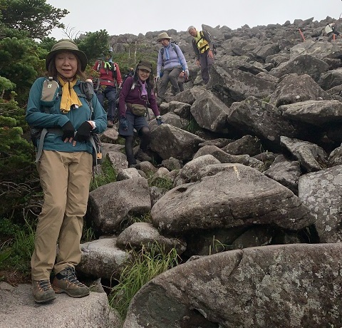 朝、5時に宿を出発して清々しい空気の中、山道を進む。初めは両脇に熊笹が茂る歩きやすい道が、途中からは大きな石がゴロゴロと散在する道になり、ひたすら登り詰めると頂上は今まで見たことがないほど広く、大きな石だらけで不思議な光景だった。 | |