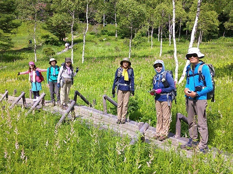 色とりどりの湿原の花々が咲き、ハンドブックを片手に名前を探しながら行くので中々前に進まなかった。のんびりと気持ちの良い湿原歩きを楽しむ。入笠山の山頂では雲がかかっていて展望が望めず残念だったが、下ってきて八ヶ岳の大展望を目の前にした時は感動した。 | |
