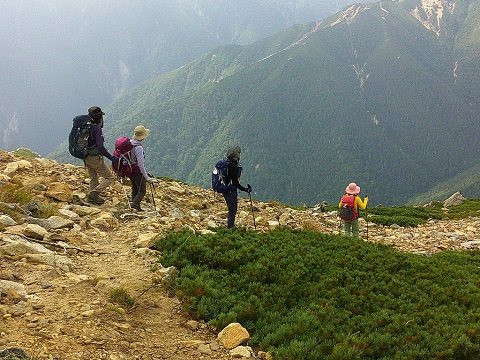 三股からのコースは初めは木の根っこの段階で段差の大きいのもあり、高度1300mほど登った。その後、突然現れた岩稜は結構急で、常念岳近くまで続いた。前常念岳先の分岐から常念小屋の迂回ルートは「上級者コース/危険」と書かれていたので断念し、常念岳近くまで登ってから下るコースを選んだ。 | |