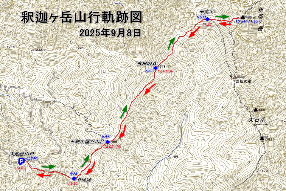 【コースタイム】太尾登山口(7:58)~P1434(8:23)~不動小屋谷出合(8:41)~古田の森(9:25)~千丈平(10:00)~釈迦ヶ岳(10:31/11:12昼食)~千丈平(11:33)~古田の森(12:10/30)~不動小屋谷出合(13:05/20)~P1434(13:39)~太尾登山口(14:02) |