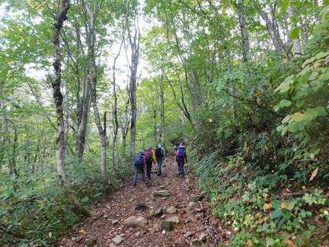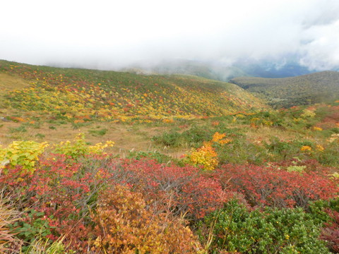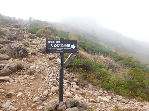 | 曇りの空模様の中で宿を出発したが、あだたら高原スキー場に到着すると、雲が晴れてゆき、紅葉した山の景色を楽しみながら山頂に着く。しかし、山頂に着く手前からガスが上がってきて、山頂ではガスに囲まれ眺望を望むことができなかった。 山頂で昼食をとり、再びガスの上がった道を紅葉を楽しみながら、峰の辻から建替え解体中のくろがね小屋を経て砂利道の林道を通り、山麓駅に戻った。 |