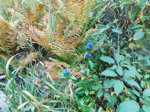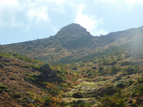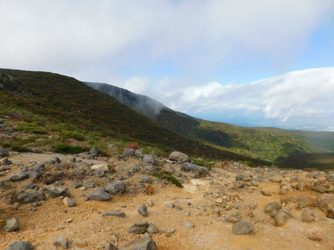 | 曇空の下、登山スタート。暫くは鬱蒼とした緑の中を歩く。温泉跡では硫黄の臭い、足元では竜胆が咲く。上がるに連れて紅葉、黄葉が増えていった。あいにく頂上の視界はなく猪苗代湖を眺める事も出来なかった。 | |