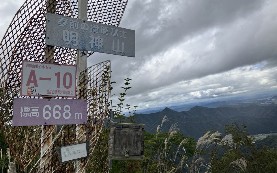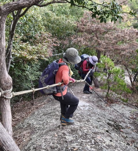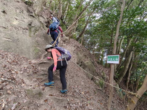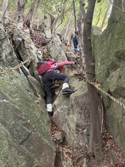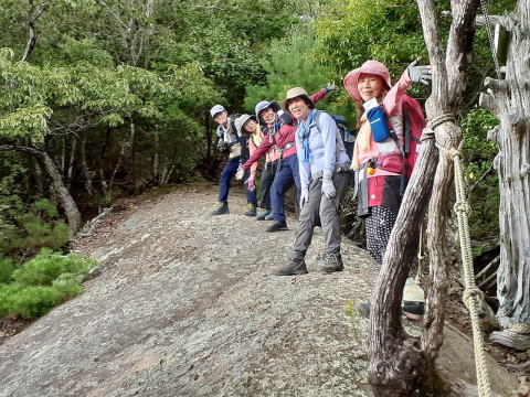 | 案山子の立っているのどかな登山口から、播磨富士・明神山のCコースを登る。途中夢眠(ムーミン)岩から合掌岩、がまん坂の急登を登り地蔵岳に着く。地蔵岳からは聳え立つ山頂が見え、そこから少し下って八丁坂を登ると山頂である。瀬戸内海まで見渡せる絶景だった。下りはAコース。西の丸からマンモスの背、大国岩と、登りも下りも面白い岩場の連続の山であった。 |
