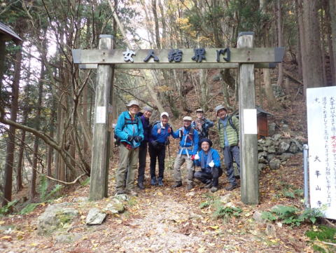| 大天井ヶ岳は大峰奥駈道の最初の難関として立ちはだかる前衛峰である。五番関登山口より登る。五番関までは、植林の急坂であるが、その後は緩やかな尾根歩きが続く。落ち葉でふかふかとして歩きやすい。1時間20分で頂上に着いた。下山後は、洞川温泉に入りさっぱりした。夕方からは、貸し切りのやすらぎ荘で長い饗宴を楽しんだ。 |