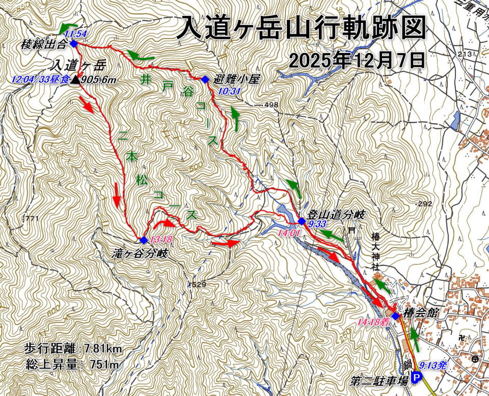 | 【コースタイム】椿大神社第二駐車場(9:13)~登山道分岐(9:13)~避難小屋(10:31)~稜線出合(11:54)~入道ヶ岳(12:04/33昼食)~滝ヶ谷分岐(13:13)~登山道分岐(14:01)~椿会館(14:18) |