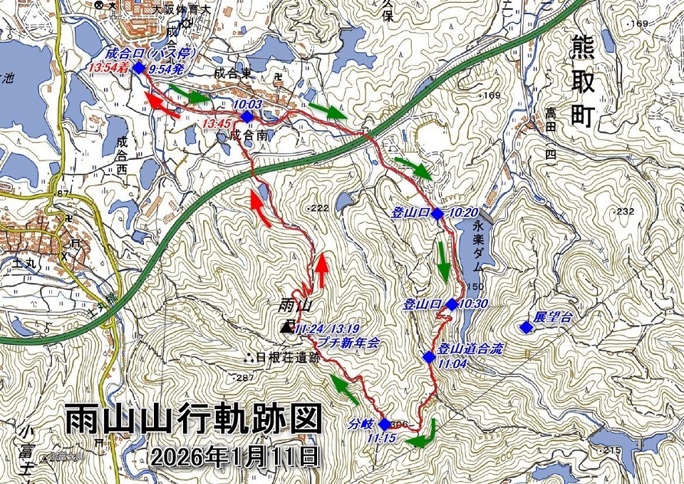 | 【コースタイム】成合口バス停(9:54)〜成合南(10:03)〜永楽ダム分岐(10:20)〜登山口(10:30)〜登山ルート合流(11:04)〜分岐(11:15)〜雨山(11:24/13:19プチ宴会)〜成合南(13:45)〜成合口バス停(13:54) | |
