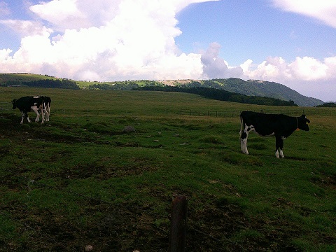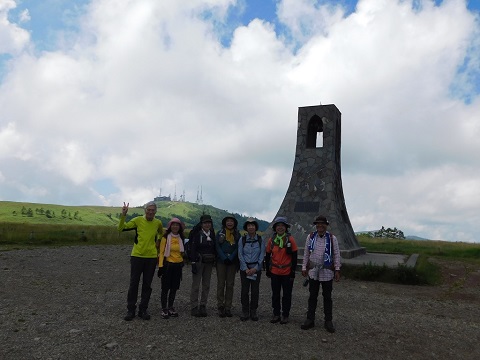 標高2000mの日本一の高さと広さの美ヶ原高原、広大な草原の牧場で牛がのんびりと草を食んでいる。道はほぼ水平で歩きやすいが黒い雲が立ち込め雷のゴロゴロと不気味な音が絶えず自聞こえてくる。目的の王ヶ鼻まで行くとついに雨が降り出した。アルプス展望コースは展望がないものの幾重にも重なる緑の草原を眺めながらの下りを楽しんだ。 | |