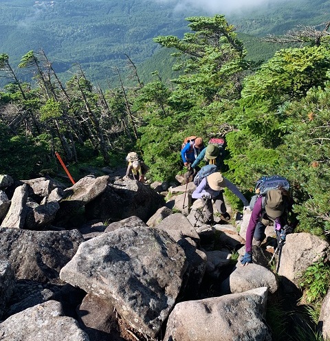 朝、5時に宿を出発して清々しい空気の中、山道を進む。初めは両脇に熊笹が茂る歩きやすい道が、途中からは大きな石がゴロゴロと散在する道になり、ひたすら登り詰めると頂上は今まで見たことがないほど広く、大きな石だらけで不思議な光景だった。 | |