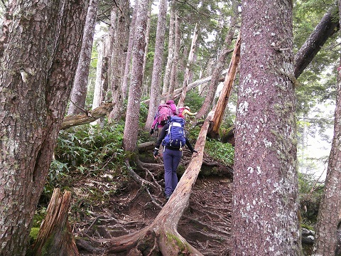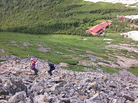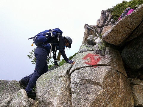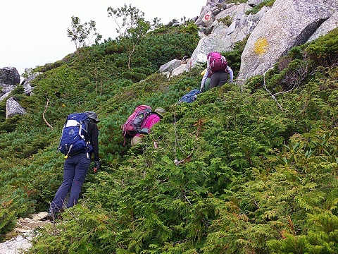 三股からのコースは初めは木の根っこの段階で段差の大きいのもあり、高度1300mほど登った。その後、突然現れた岩稜は結構急で、常念岳近くまで続いた。前常念岳先の分岐から常念小屋の迂回ルートは「上級者コース/危険」と書かれていたので断念し、常念岳近くまで登ってから下るコースを選んだ。 | |